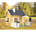 Leikkimökki lasten iloksi! Leikkimökin toimitetaan rakennussarjana ilman pintakäsittelyä. Ikkunat ovat plexilasia. Leikkimökki on CE-merkitty.